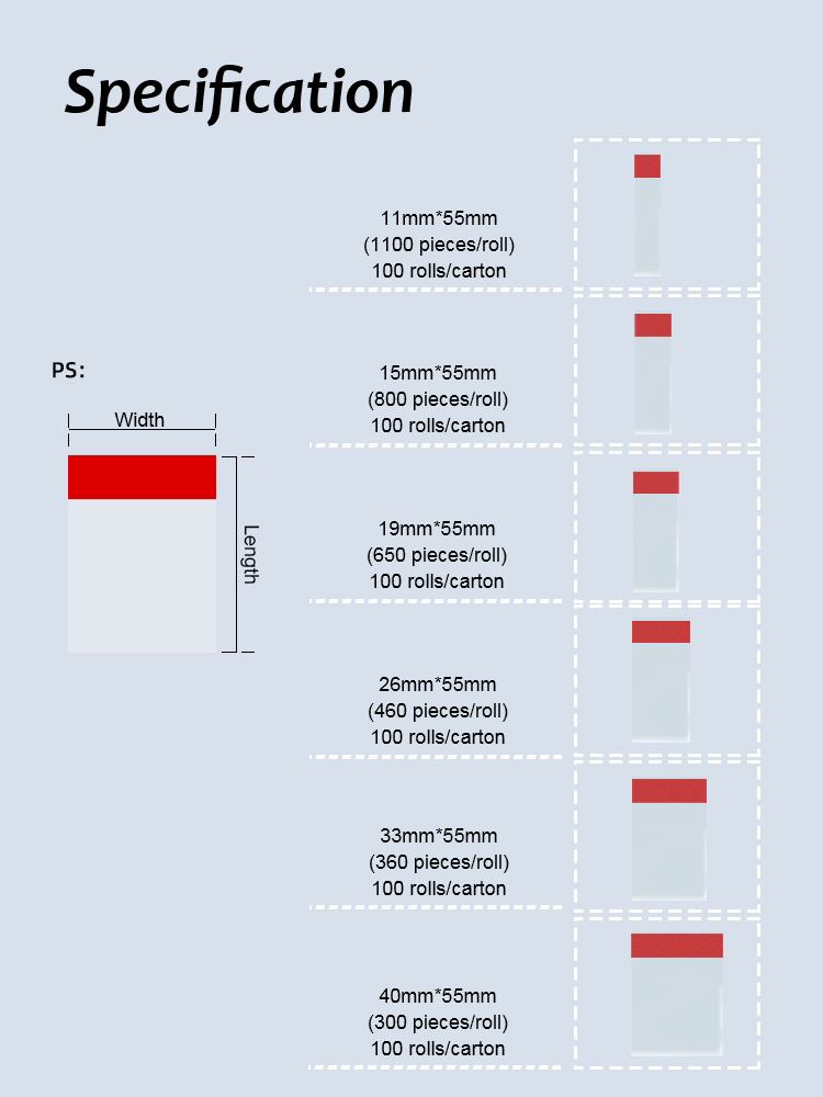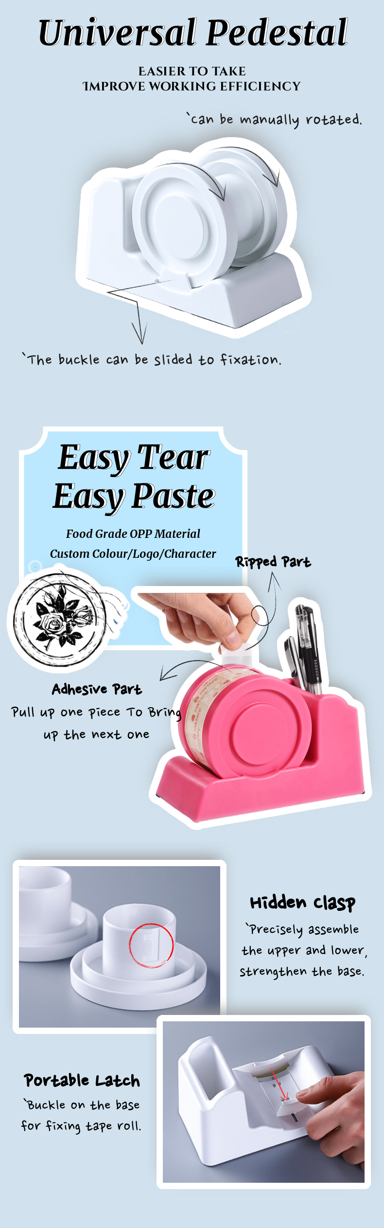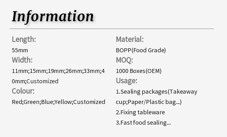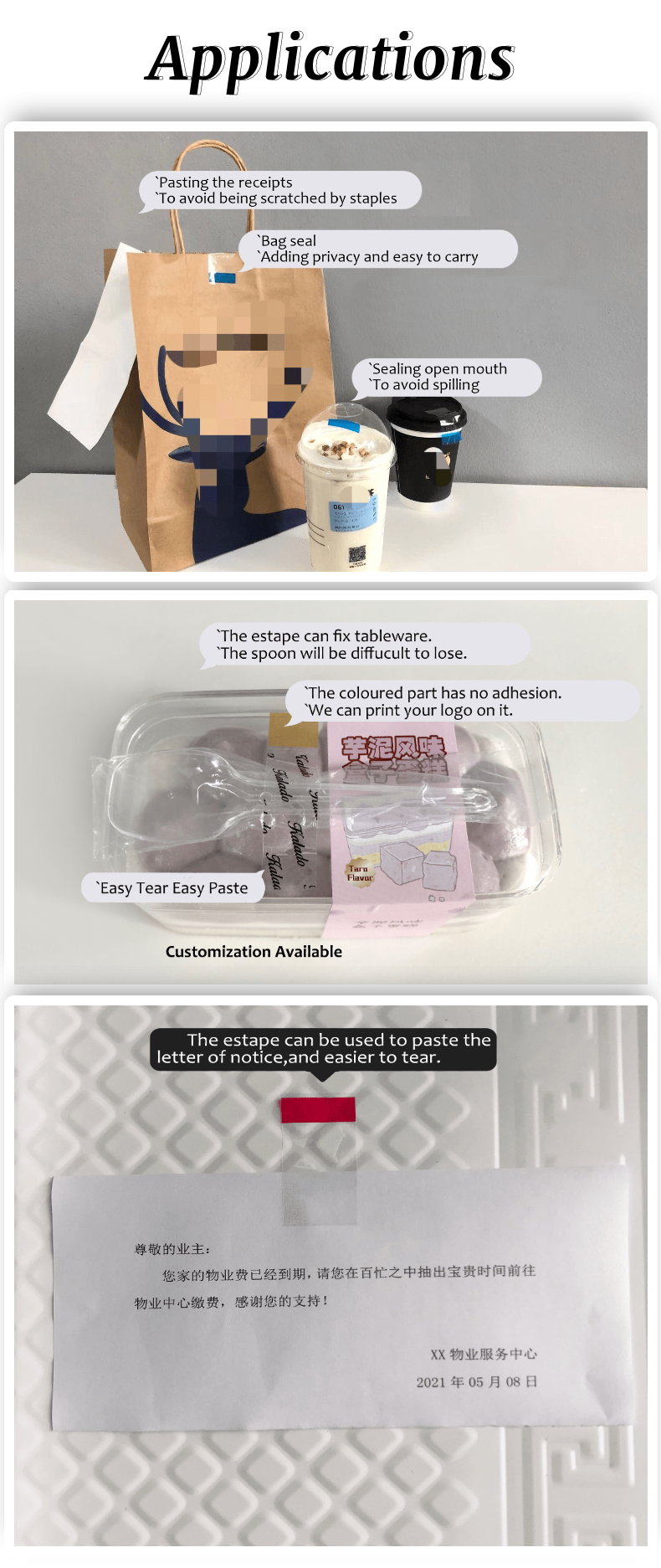 Una especie de cinta adhesiva en escamas de una cara fácil de rasgar y pegar, que está hecha de material OPP / PE.Cada pieza de cinta tiene dos partes: la parte adhesiva y la parte sin pegamento.Es muy versátil.Puede sellar fácilmente envases de alimentos como la leche -Tazas de té, tazas de café o bolsas de pan, y marcar páginas o pegar notas… Para sellar envases de alimentos, evita que la comida para llevar gotee y mejora la conservación de los alimentos. De pegar estape en libros, encontrarás la página fácilmente. También puede escribir notas en él. También proporcionamos la base de la cinta, para que pueda rasgar la estape más fácilmente.